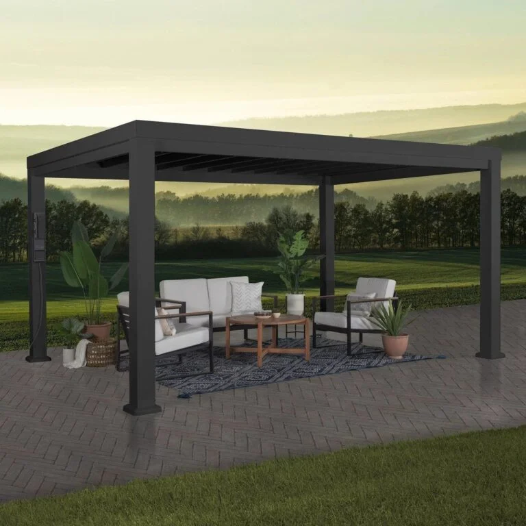 The Trenton steel pergola is Backyard Discovery’s solution to all weather, all season functionality and beauty in a stylish black finish. Our powder coated, galvanized steel construction makes the Trenton pergola maintenance free and rust resistant while offering protection against chipping, scratching, corrosion, and UV harm. The Trenton is a Pro-Tect™ certified performance structure; certified to withstand up to 100 mph winds. With a sail shade soft canopy included; the Trenton pergola is a minimalist outdoor structure design with modern, durable steel composition. Backed by a 5-year limited warranty, our high-quality steel pergolas provide market leading strength and durability in comparison to aluminum or vinyl outdoor shade products. Offered in 4 sizes, the Trenton steel pergola provides up to 192 sq. ft. of shade and plenty of room for furniture, fire pits, and entertaining. The exclusive PowerPort™ has 3 USB ports and 3 electrical outlets to use for powering outdoor lights and electronics as well as charging your devices. If you have been searching for a strong, weather resistant, modern styled pergola, look no further. Meet the Trenton galvanized steel pergola by Backyard Discovery!