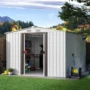 - The outdoor storage shed overall dimensions as 97.2″L x 97.2″W x 69.2″H with a door size of 66″H x 37.2″L and easy access design of sliding double door as enough height for an adult to enter through. Storage capacity 367.5 cu ft for efficient patio storage to store garden tools, mowers, power tools, or bicycles. Also, a metal shed has distinct advantages over a traditional wooden shed that make it a much more attractive choice for purchase and investments.