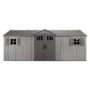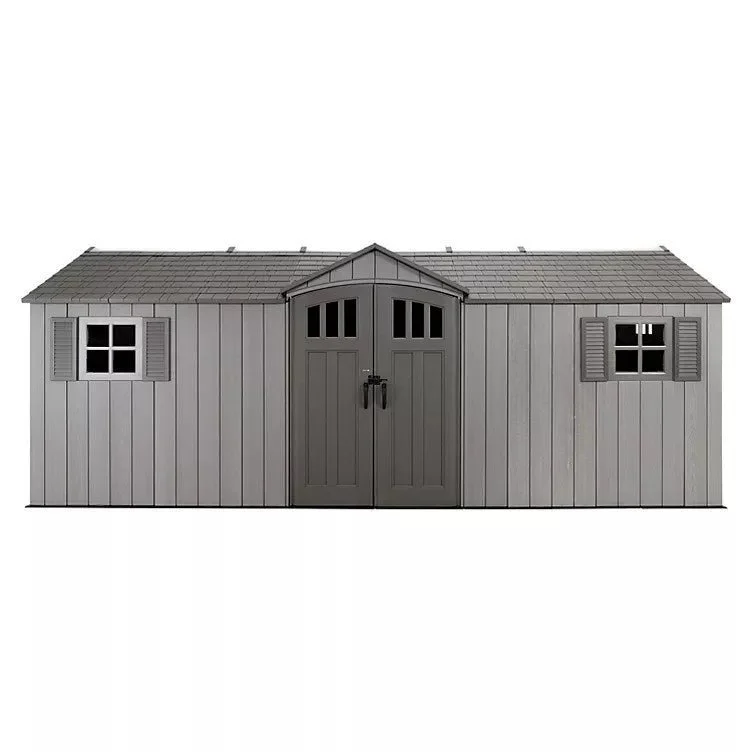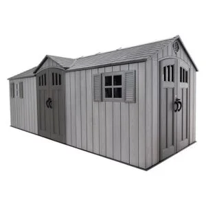 - Welcome to the next generation of Lifetime storage sheds! Introducing the Lifetime 15×8 dual entry shed with the great looking wood textured rough cut design. With all the superior materials and qualities Lifetime sheds are known for, this shed will be sure to serve you for many years. This building is constructed with dual-wall high-density polyethylene (HDPE) panels combined with five heavy duty Steel A-frame trusses to give it unmatched stregnth against the toughest elements. Panels are UV protected to give you unfading great looks and protect from cracking. The shed is stain resistant and never needs painting! Your no maintenance storage solution. Inside you’ll find high impact plastic flooring with hardwood texture looks. The floor is resistant to oil and other stains and is textured for prevent slips and falls (foundation of concrete or wood decking required). You’ll be able to get organized the first day with the included shelving and wall hooks. Natural lighting from 6 included skylights, 2 windows and transom windows on the doors will help you see clearly while working inside. Two screened vents above each gable end provides fresh air and ventilation while keeping pests out. Two swing open doors give you easy access to your stored items. Doors are pad lockable for security (pad locks not included). This extra large shed is a great option for storing riding mowers, atv’s, motorcycles, bicycles, kayaks, toys and more! You’re search is over, if this shed meets your needs and budget you are in the right place!The Lifetime 15′ x 8′ Rough Cut Shed has two sets of double doors (front and side) and features: (5) A-frame heavy duty steel trusses, (6) small skylights, (2) shatter-proof polycarbonate windows with shutters, (2) screened vents, (12) wall hooks, (1) 90″ x 9″ shelf, (2) corner shelves, and a 10-year limited warranty. Floor and installation hardware included. Comes in (3) boxes. *foundation by homeowner