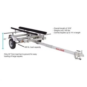 The EcoLight Sport Trailer, when bundled with a Malone carrier system, provides an excellent choice for safe and affordable kayak transport. We offer a selection of four different trailer/carrier packages to carry one, two or four kayaks. The MPG586XB EcoLight Package is designed to carry a single fishing or recreational kayak. Each trailer comes with one set of 84″ long padded bunks that work with both traditional V-style hulls or non-traditional pontoon style hulls. These marine grade trailers can be backed down a boat ramp to launch the kayak directly into the water. At 26” from the ground, loading and unloading heavy boats has never been easier. Each unit is DOT and Transport Canada certified and proudly built in the USA for years of dependable use. Provides safe travel up to a maximum of 65 mph while transporting loads up to 400 lbs. Features a reinforced extra-long tongue, 58″ wide steel load bars, molded fenders, 8″ high-speed tires and a 2″ receiver with lift handle.